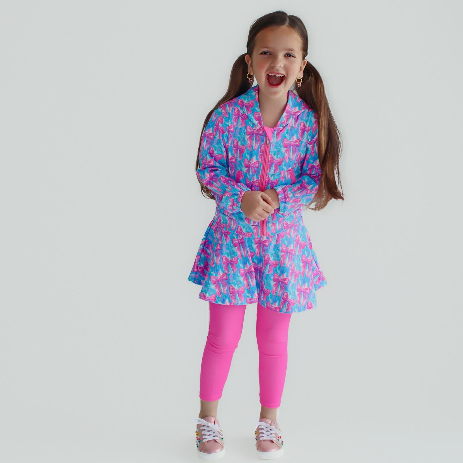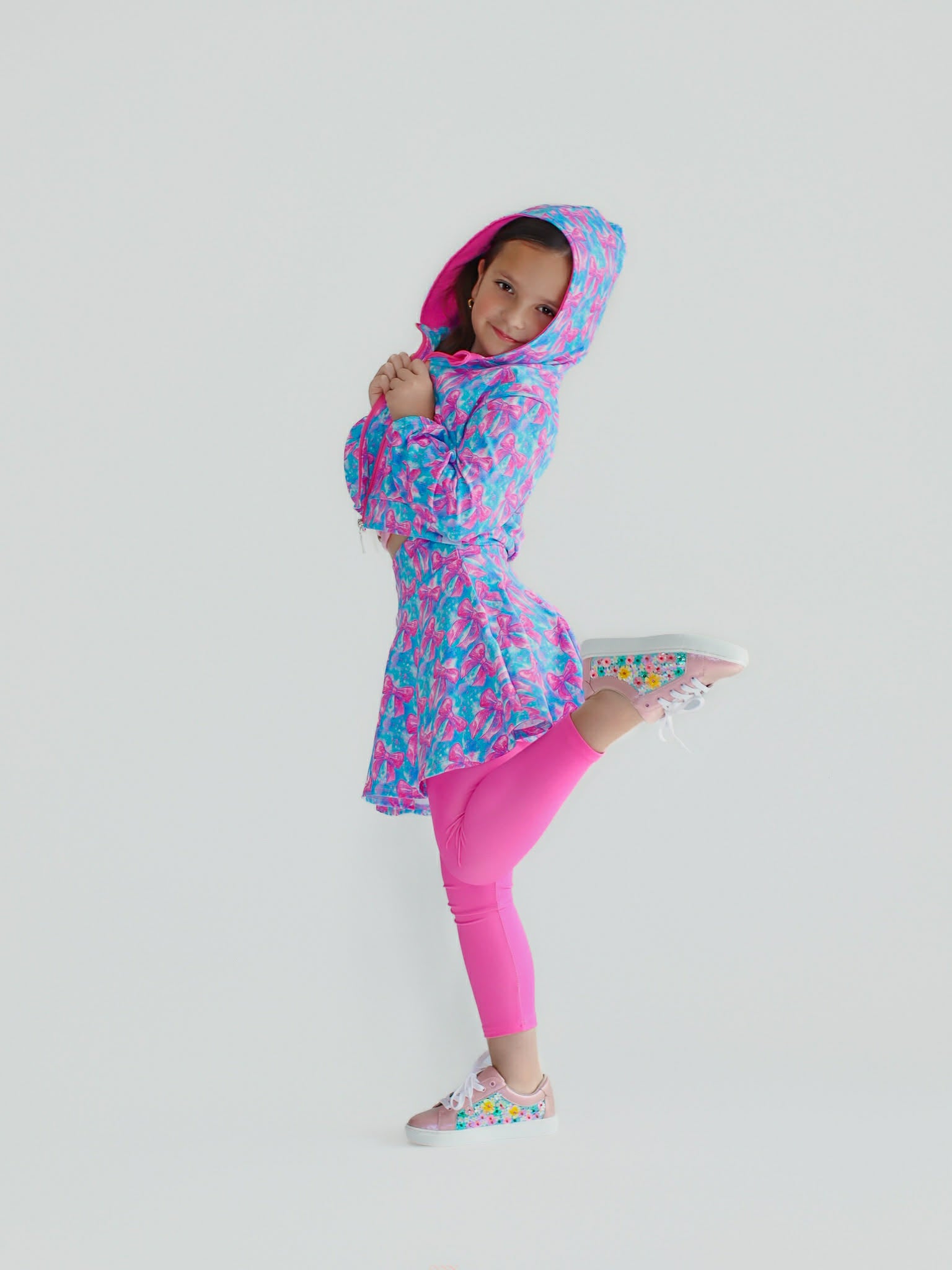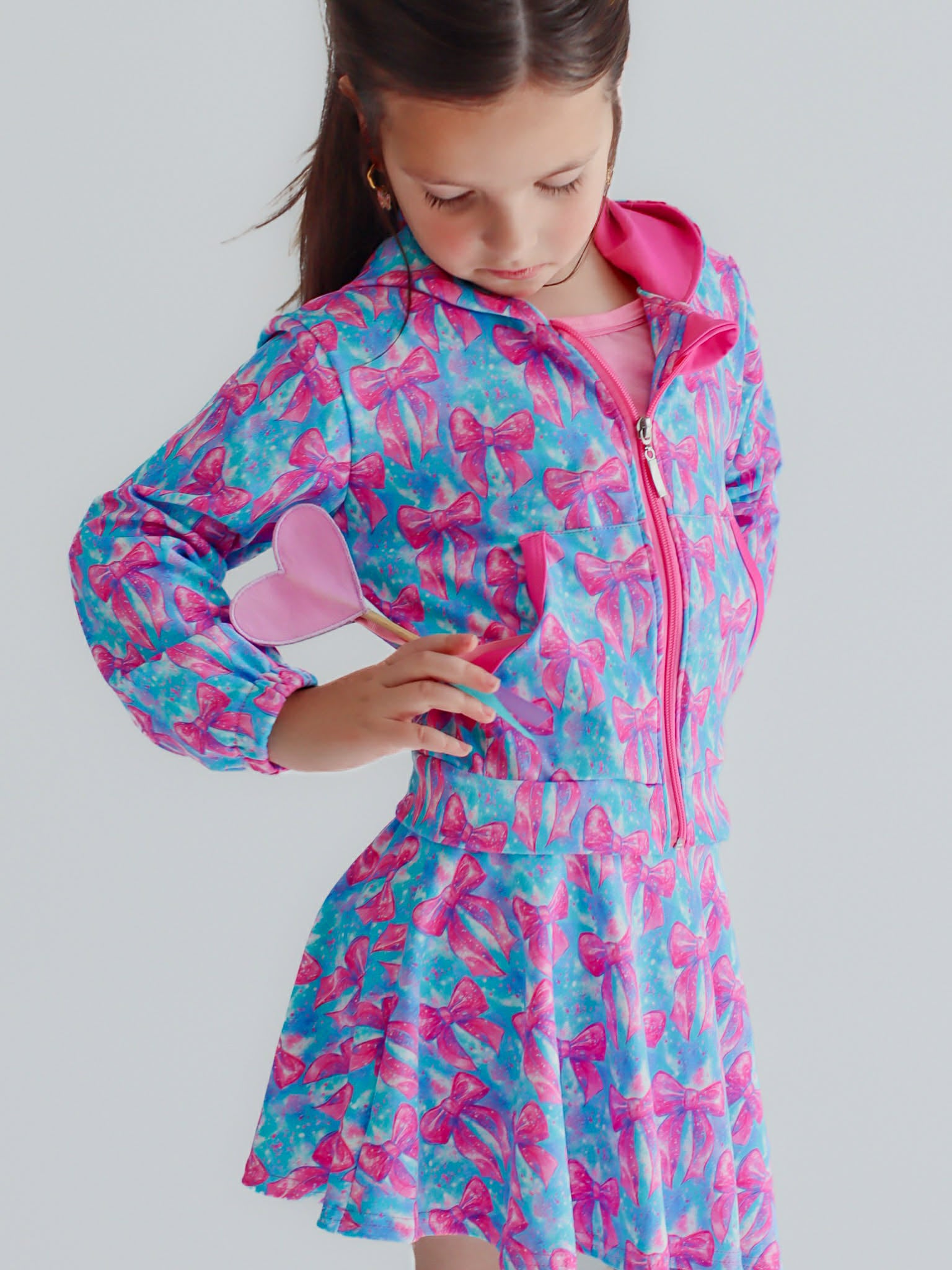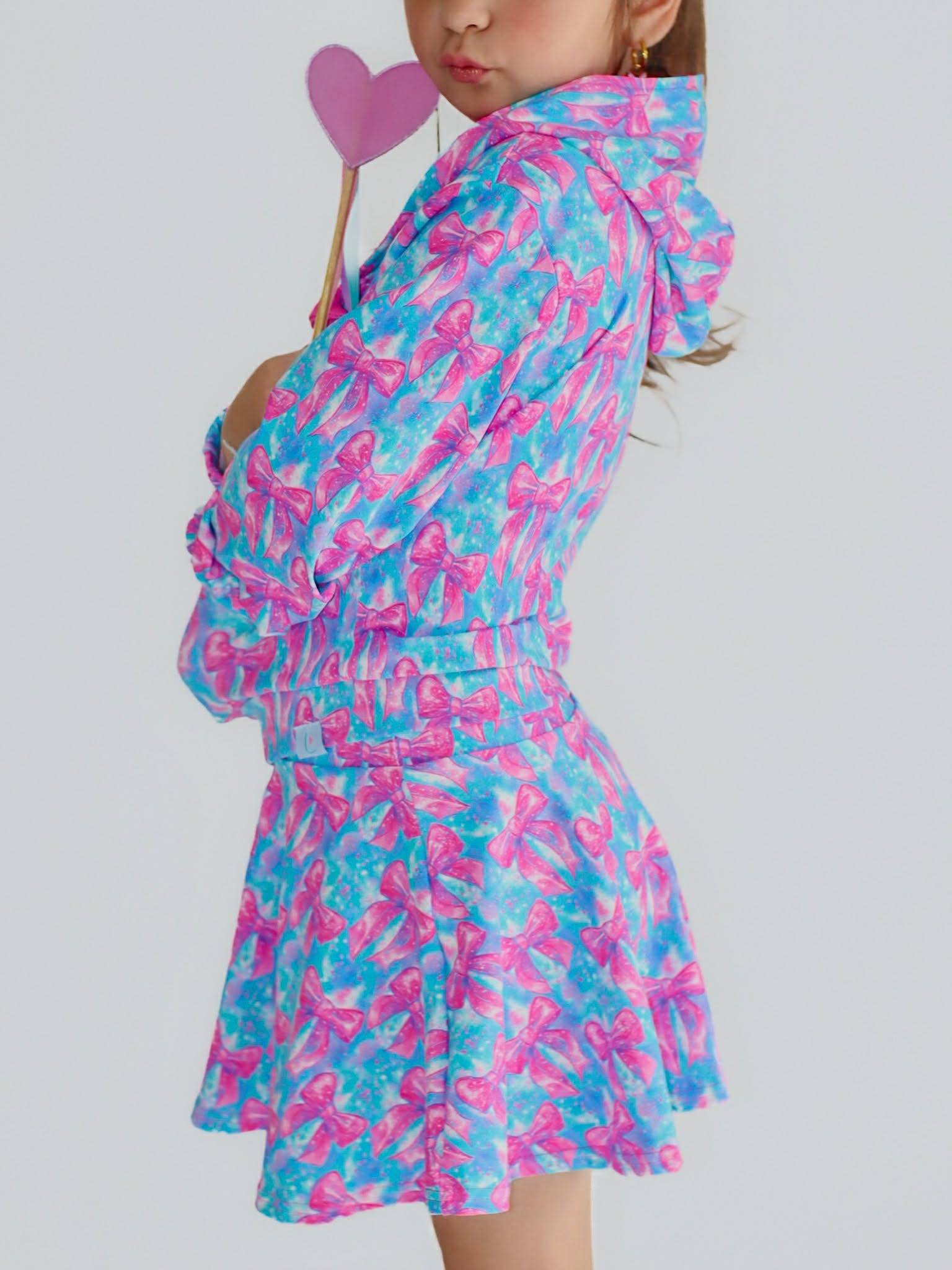 3 piece set comes with hoodie with pockets and workable drawstrings and pockets, Leggings in love print, and Heart skirt!