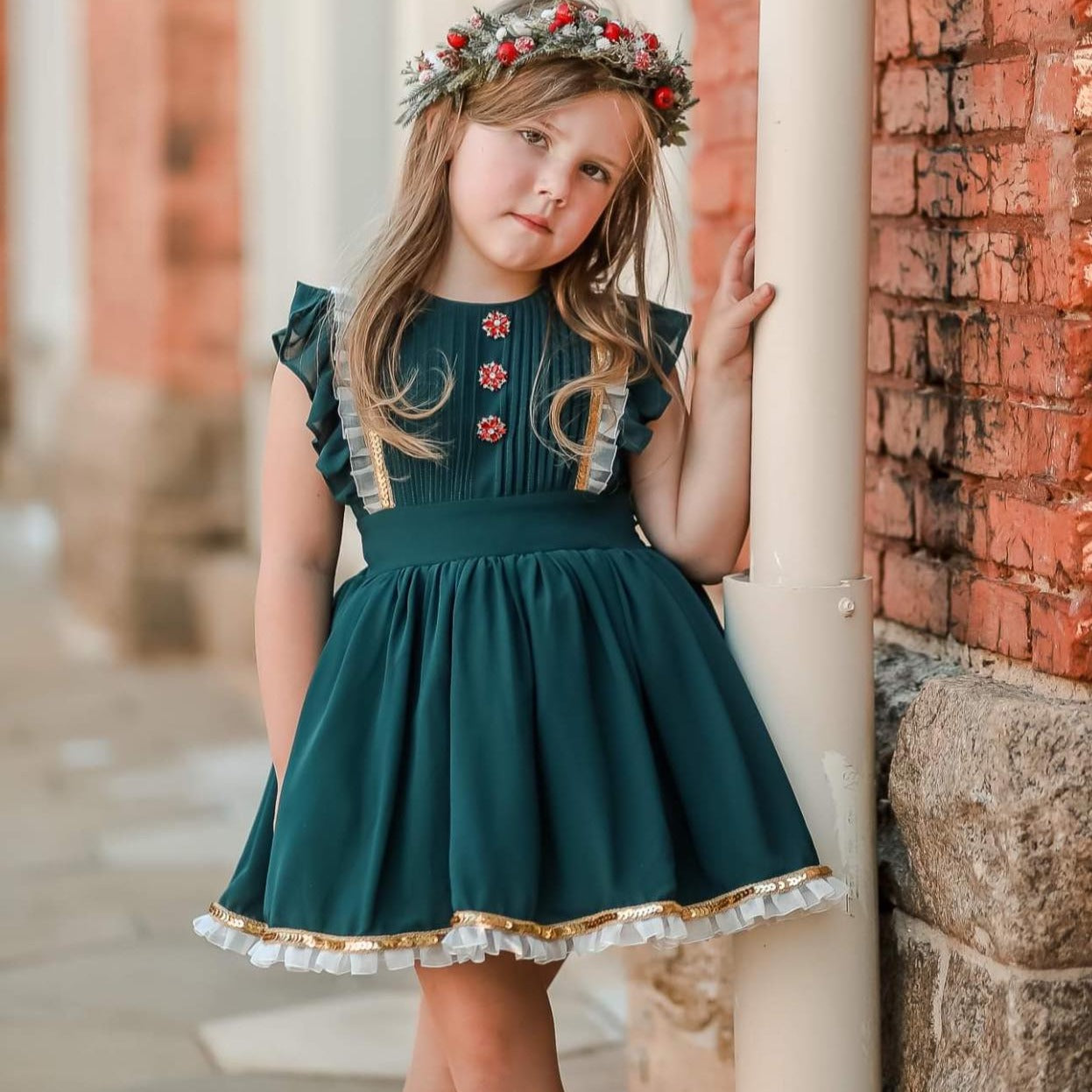 Beautiful vintage inspired gold sequin and tulle ruffle detail on the flutter pinafore ruffles and skirt.