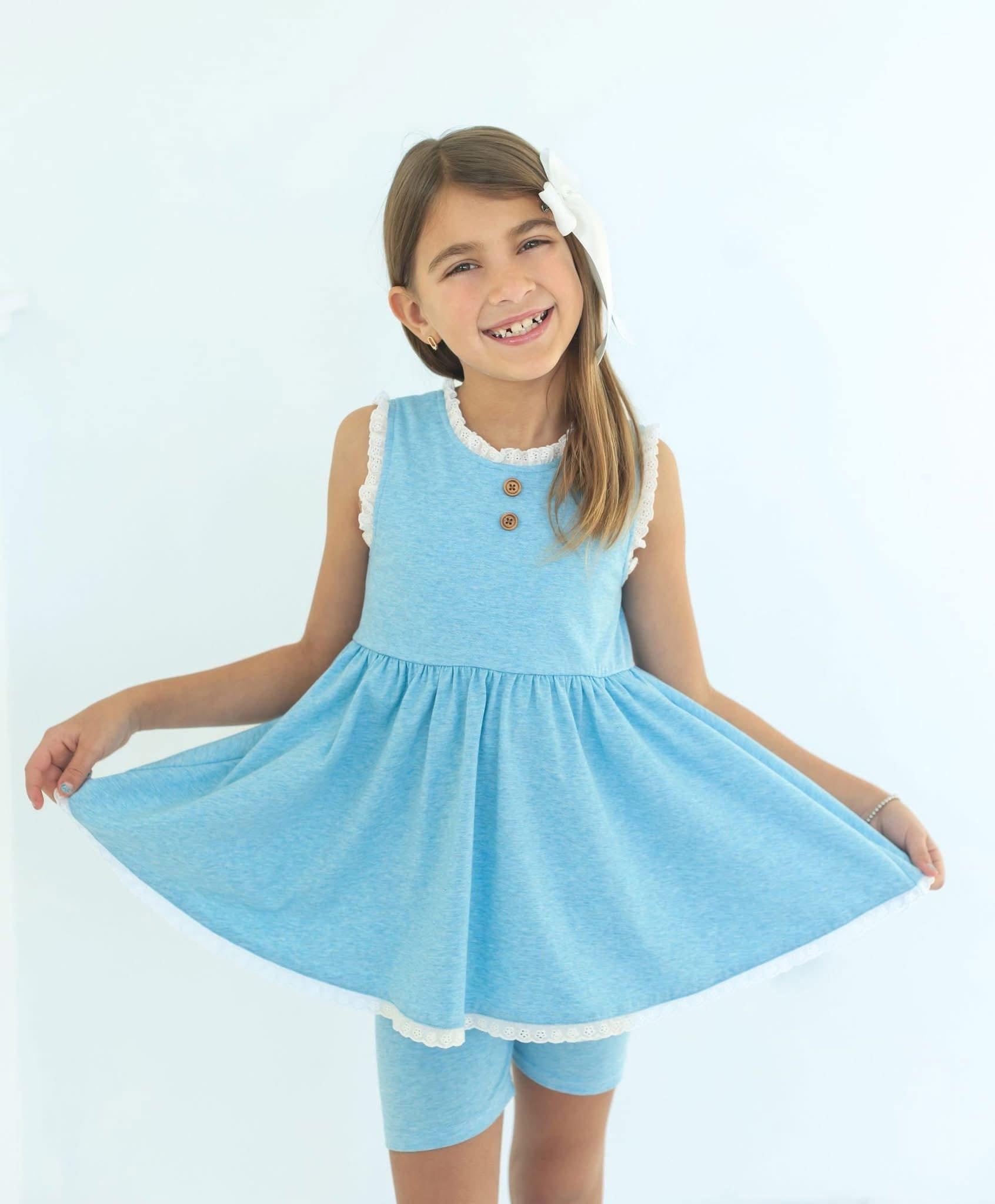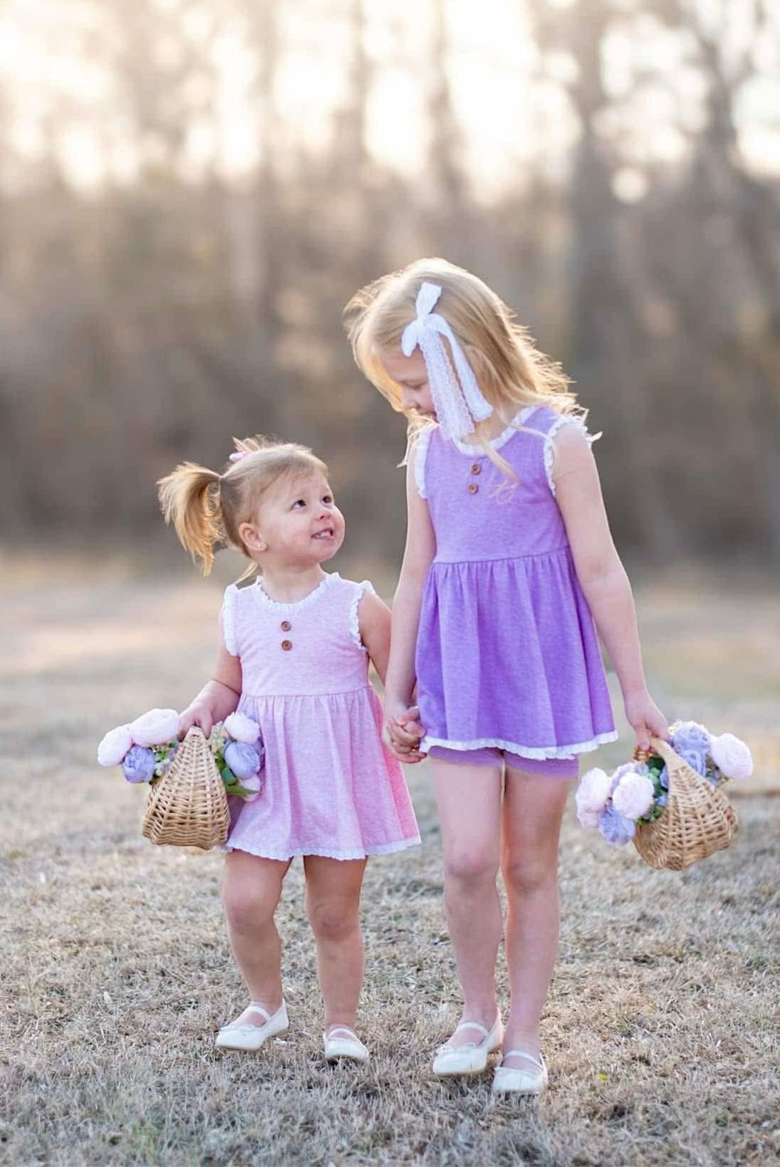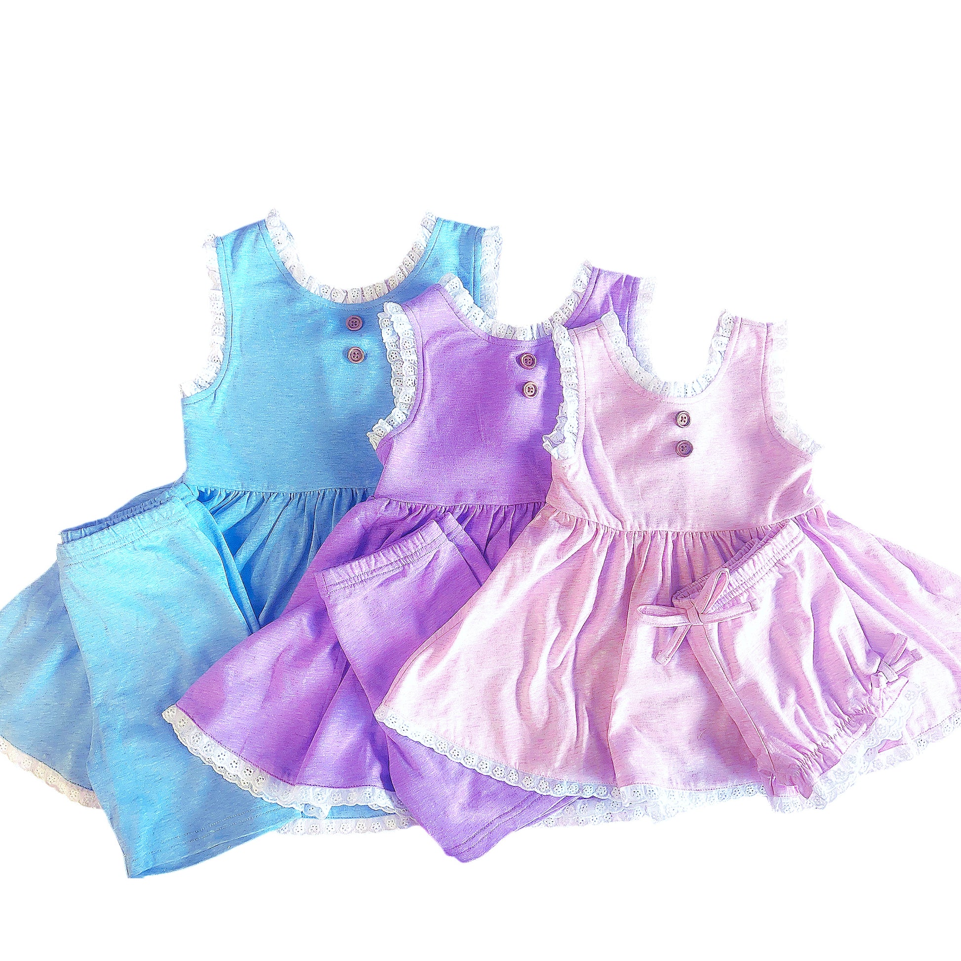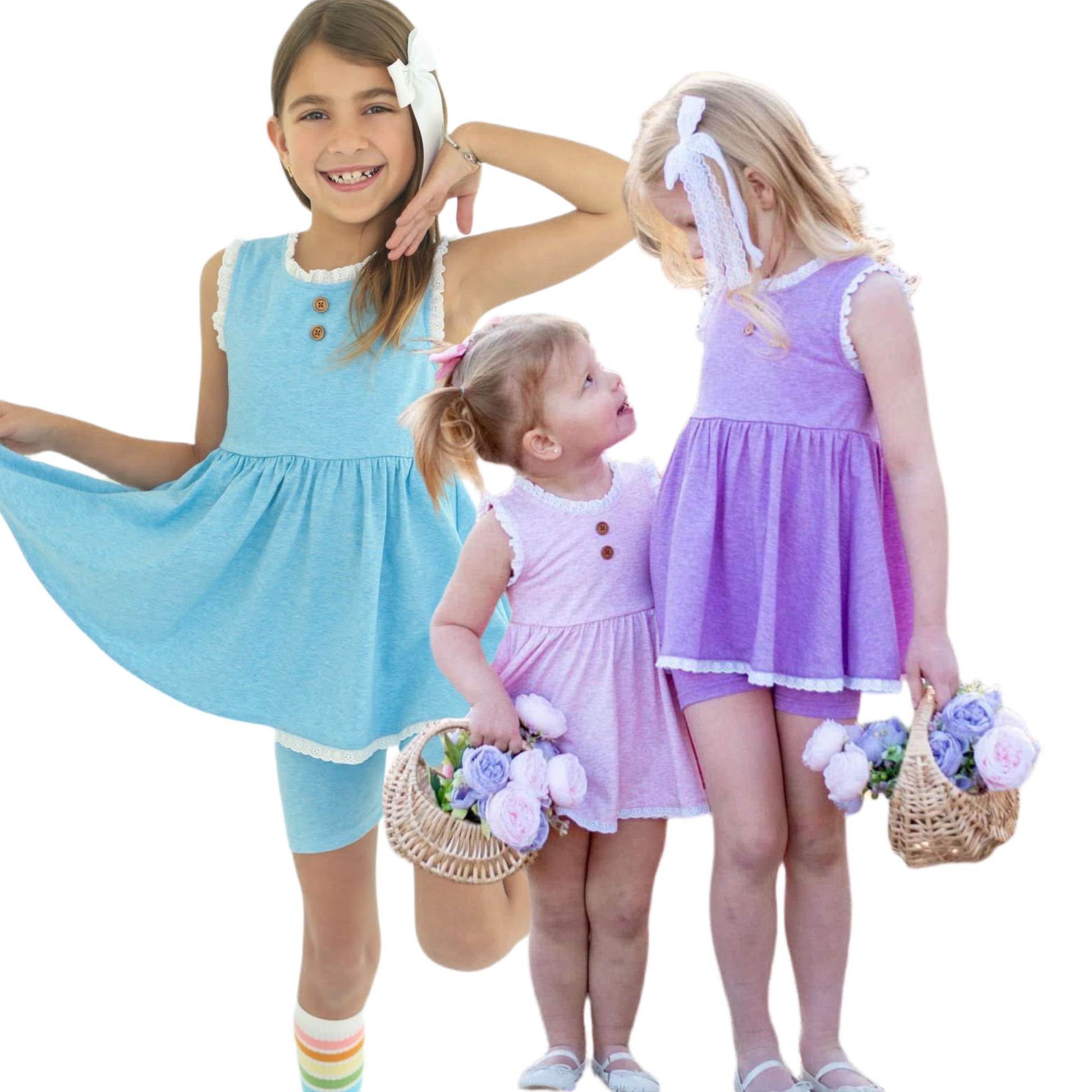 Heathered pastels in an adele set? YES! Blue, pink and lavender heathered fabric, super soft. Fully lined chests. Eyelet lace trim.
