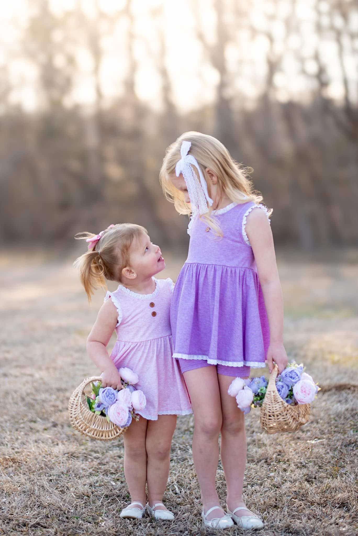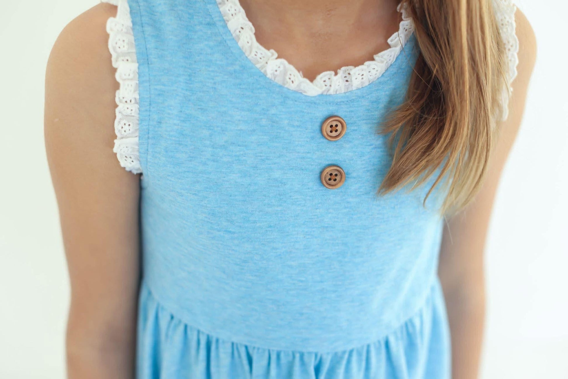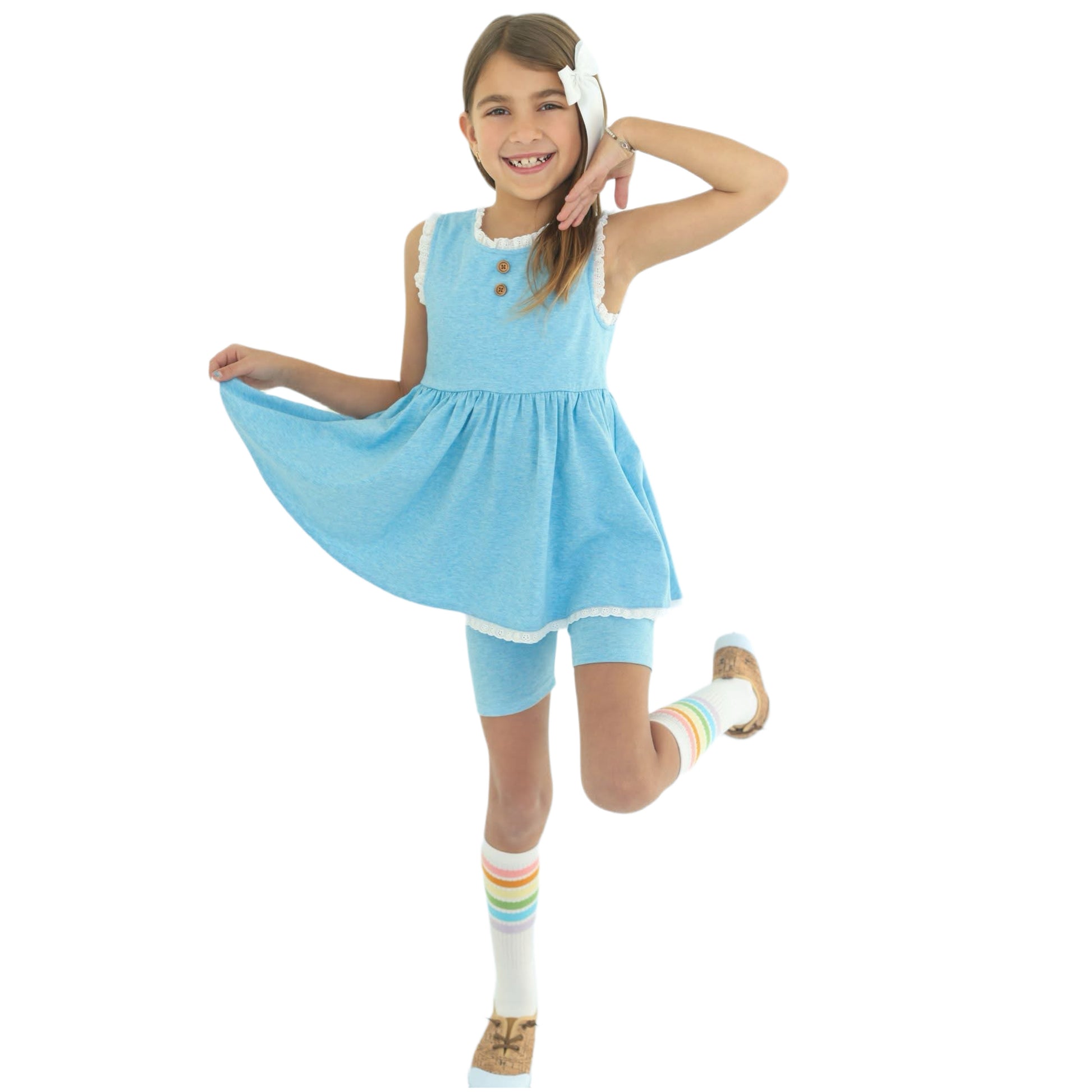 Heathered pastels in an adele set? YES! Blue, pink and lavender heathered fabric, super soft. Fully lined chests. Eyelet lace trim.
