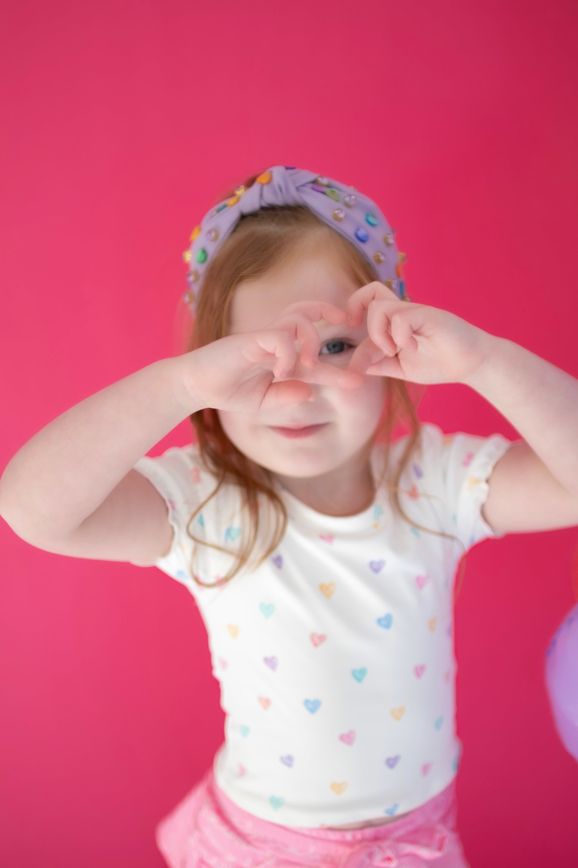 The sweetest heart print is back! Puff sleeve fitted top, with cut out heart on back. Love print skort with elastic waist and workable drawstring with pockets.