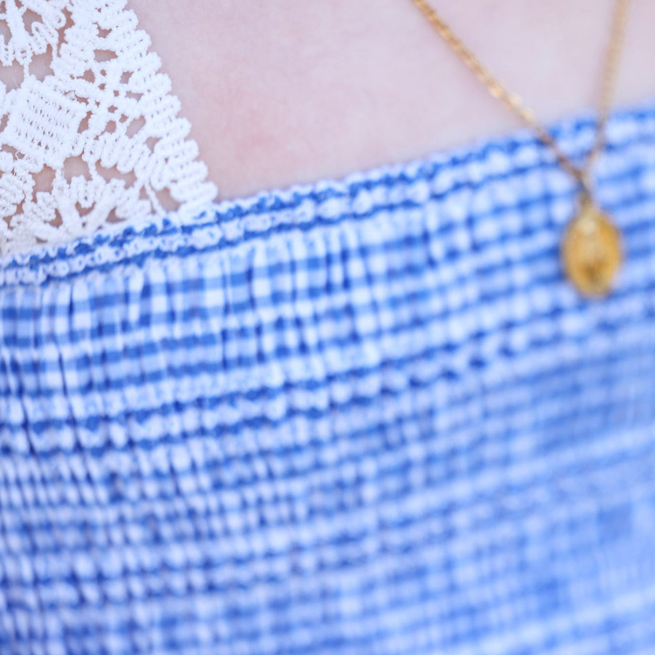 New silhouette design! Smocked chest, adjustable straps, stretch fit, lace trim skirt, fully lined! Dress length. The fabric is a dimity embroidered blue and white gingham woven cotton.