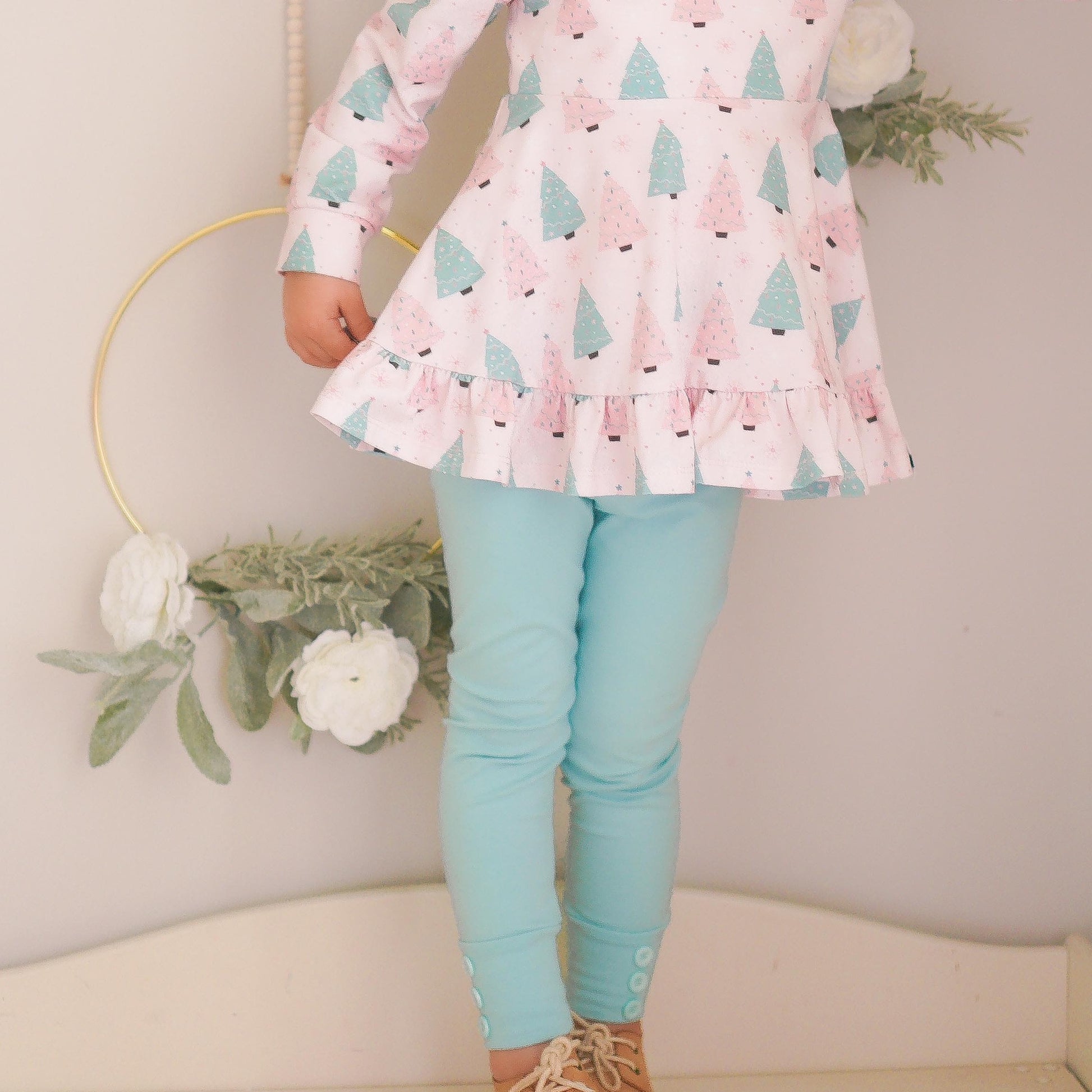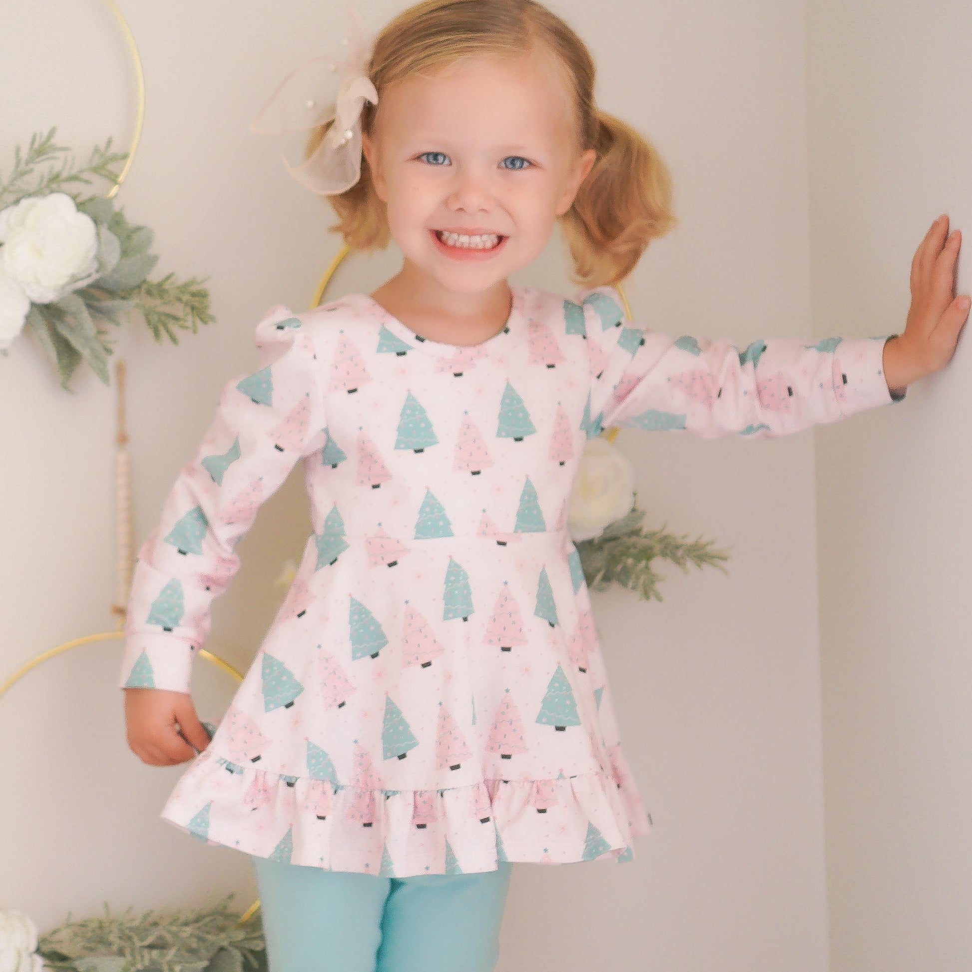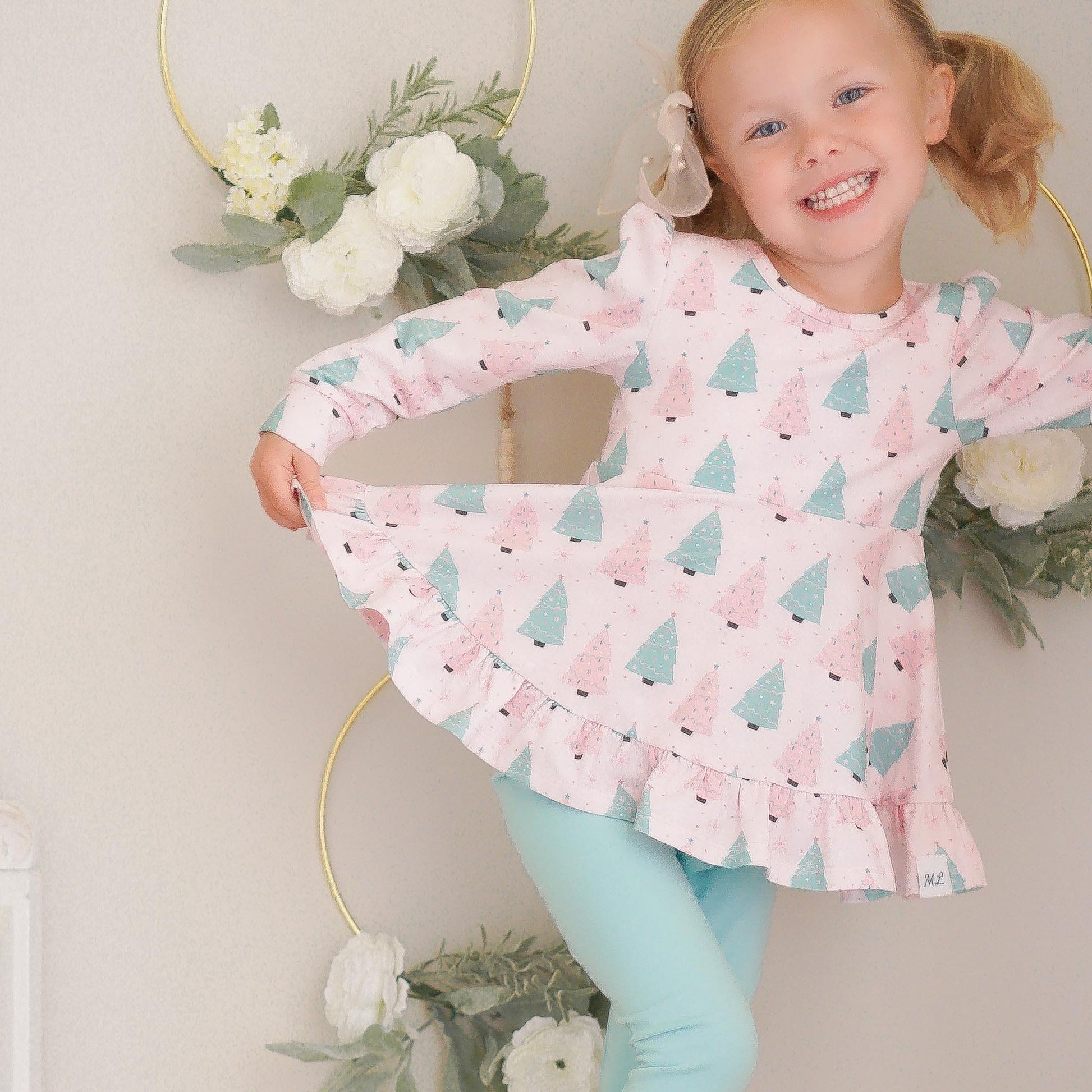 - Twirl tunic with ruffle in pink with green and pink trees and snowflakes