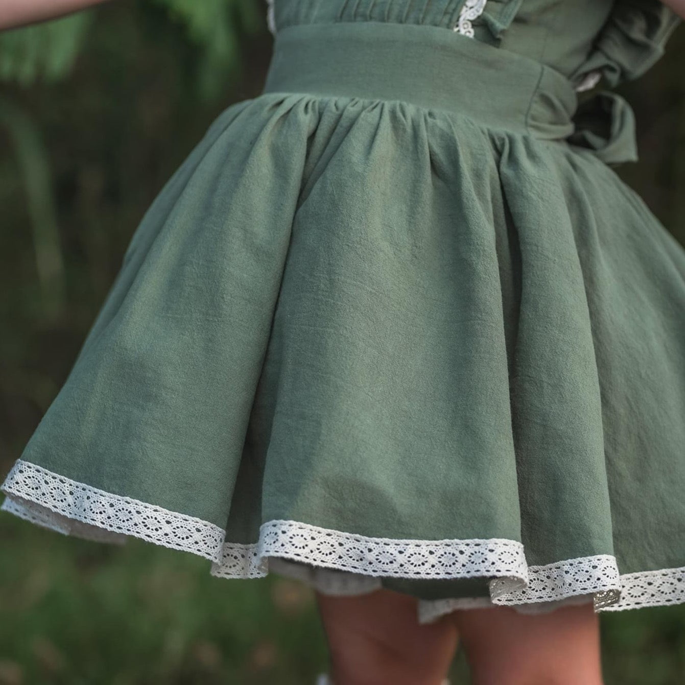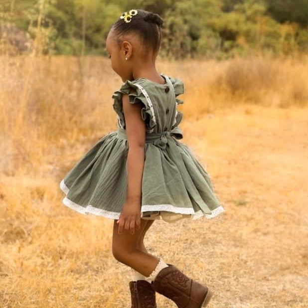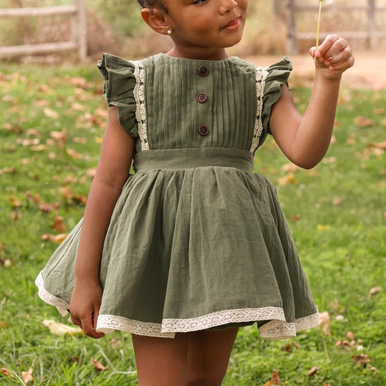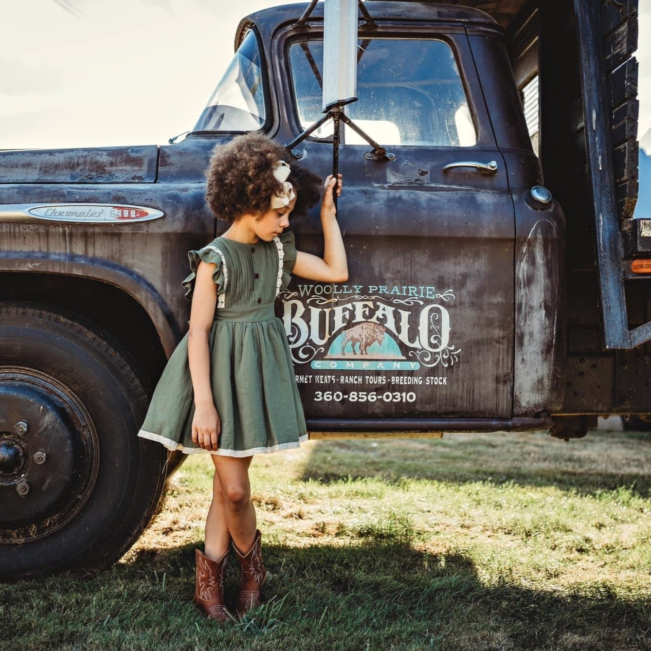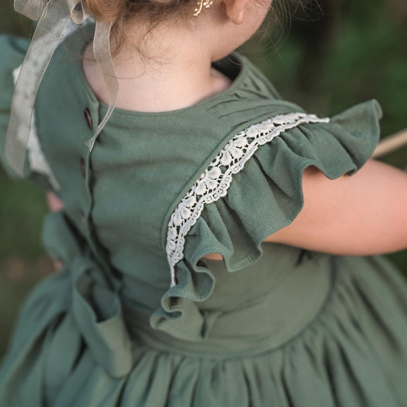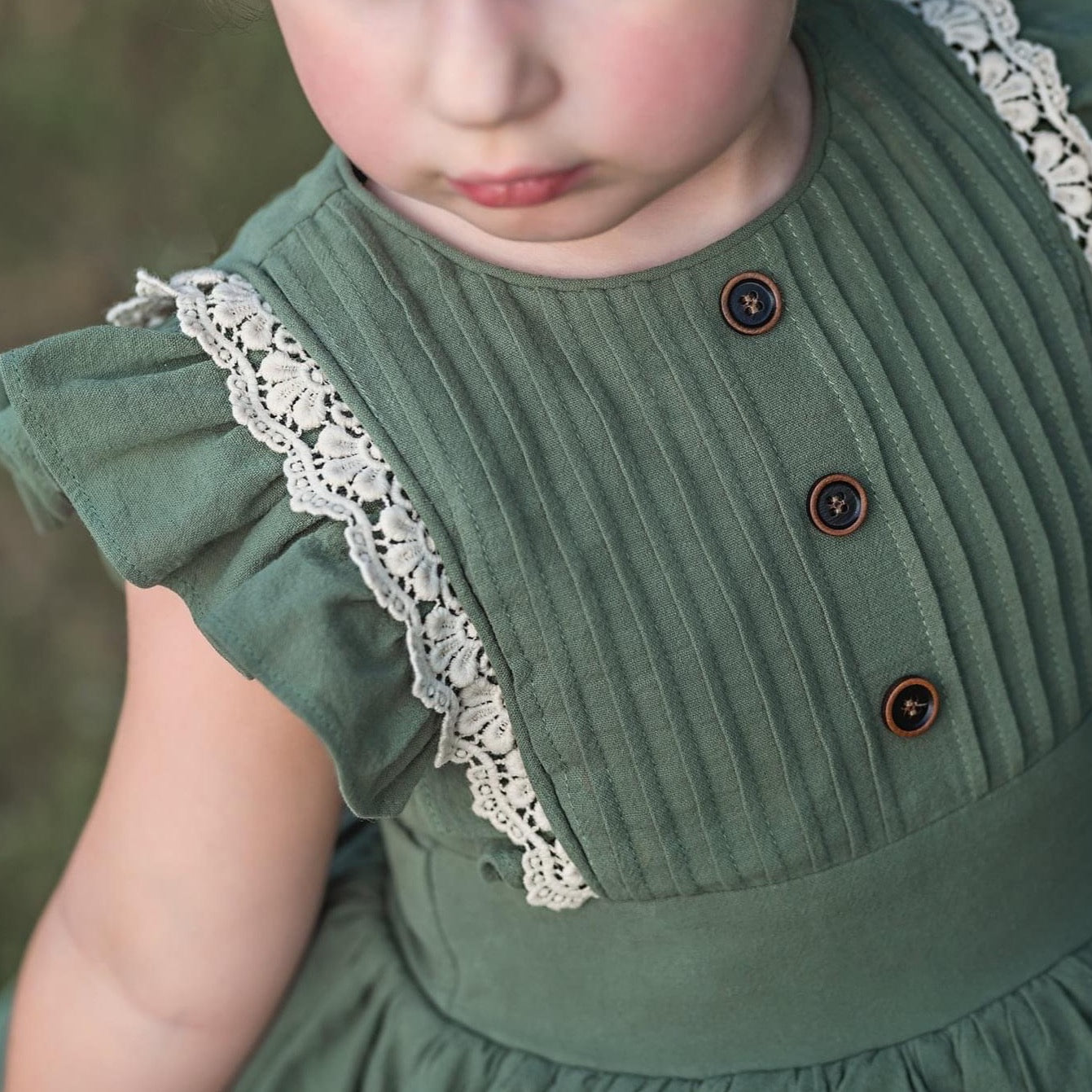 Norah is back! In the most beautiful olive almost sage green. This time we flipped the pintucks to vertical and added wooden buttons on the chest.