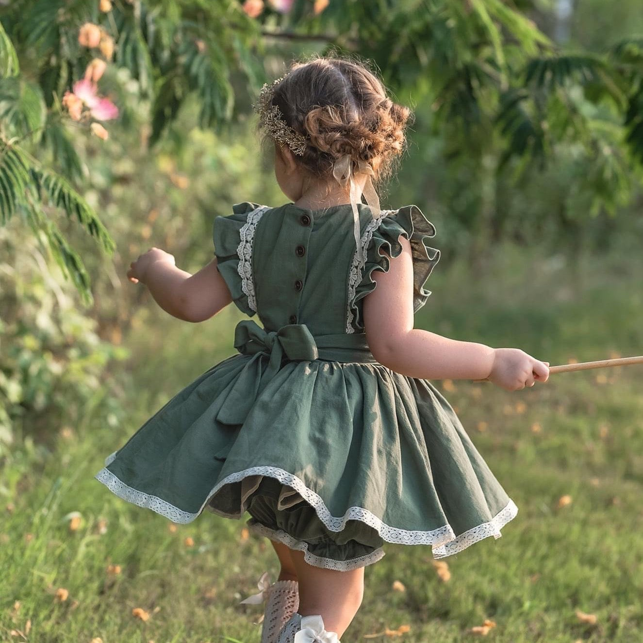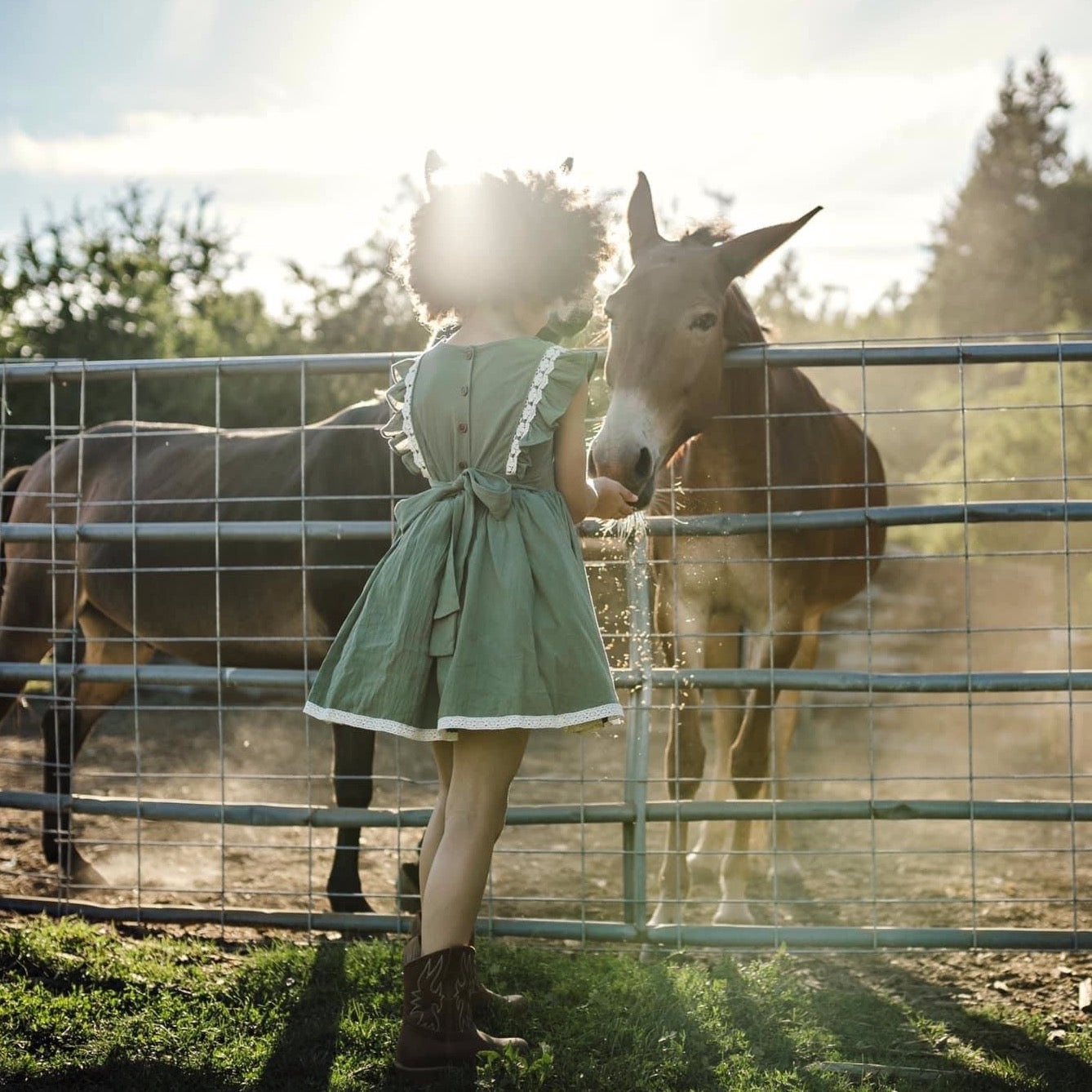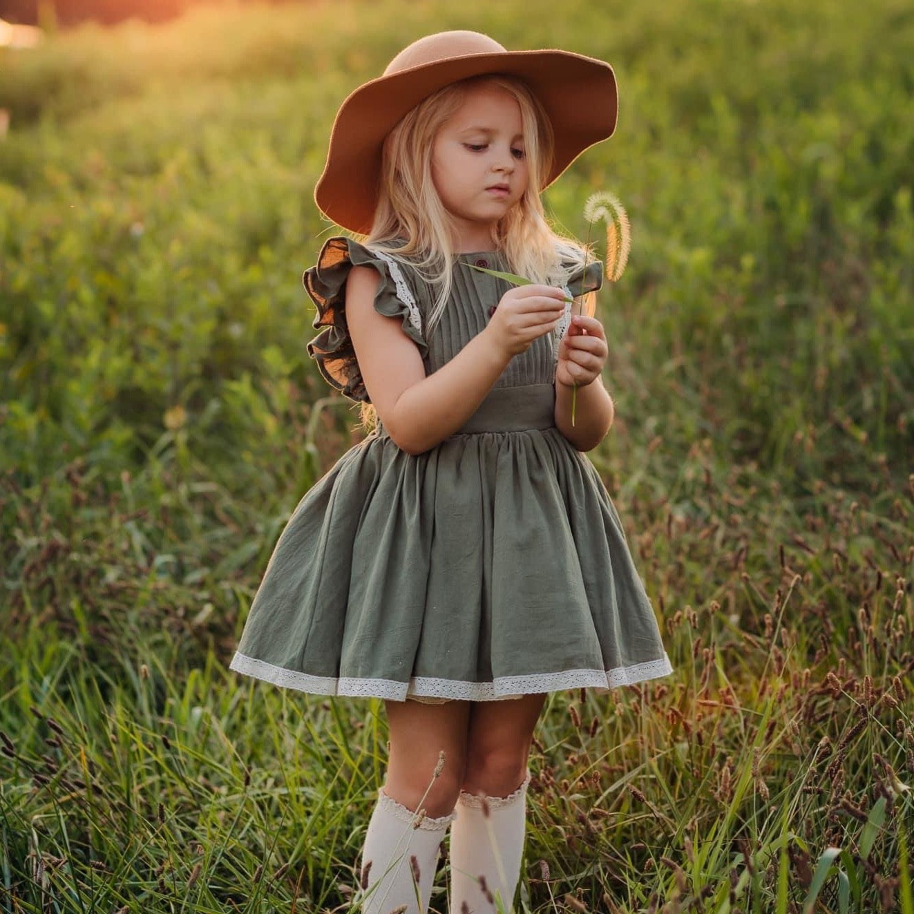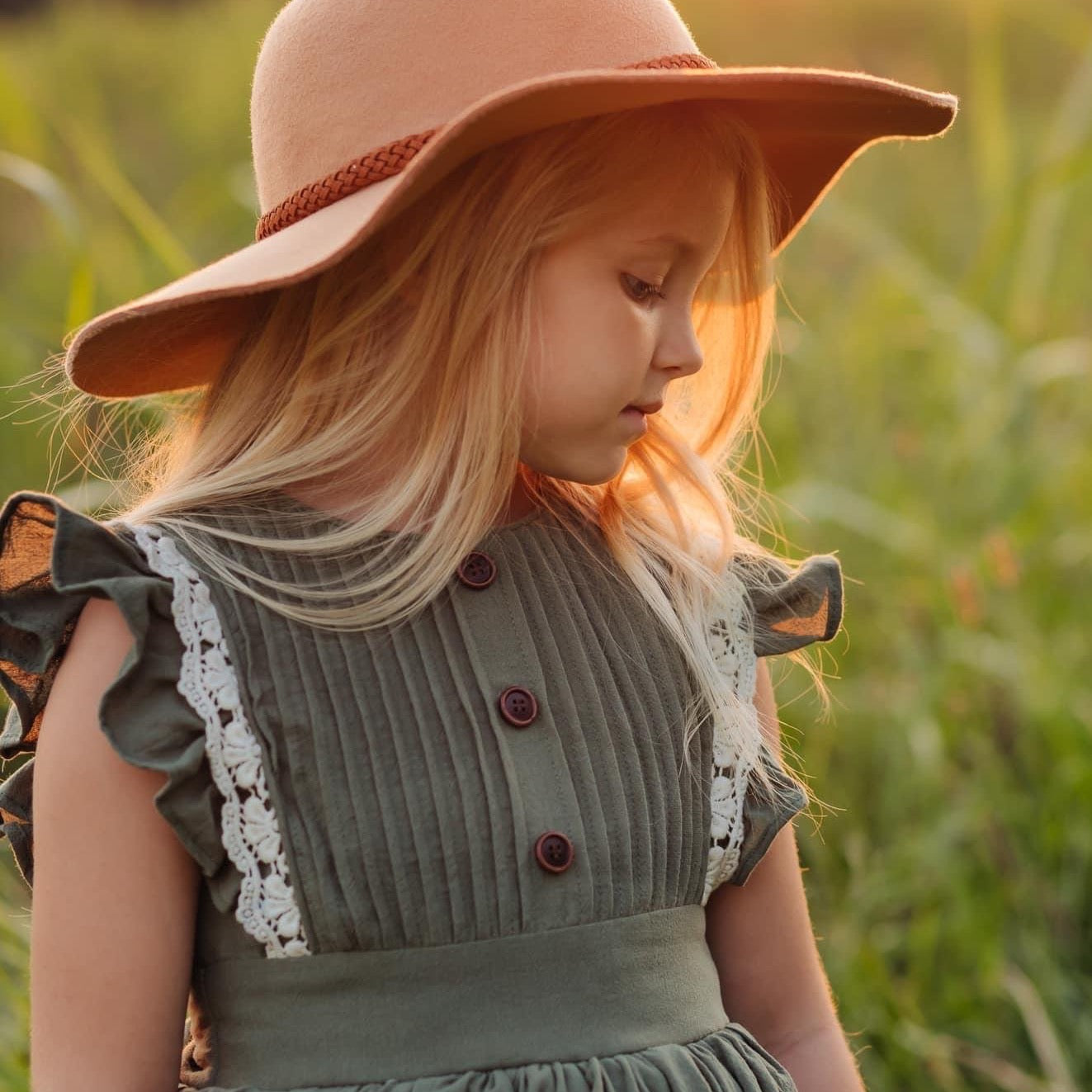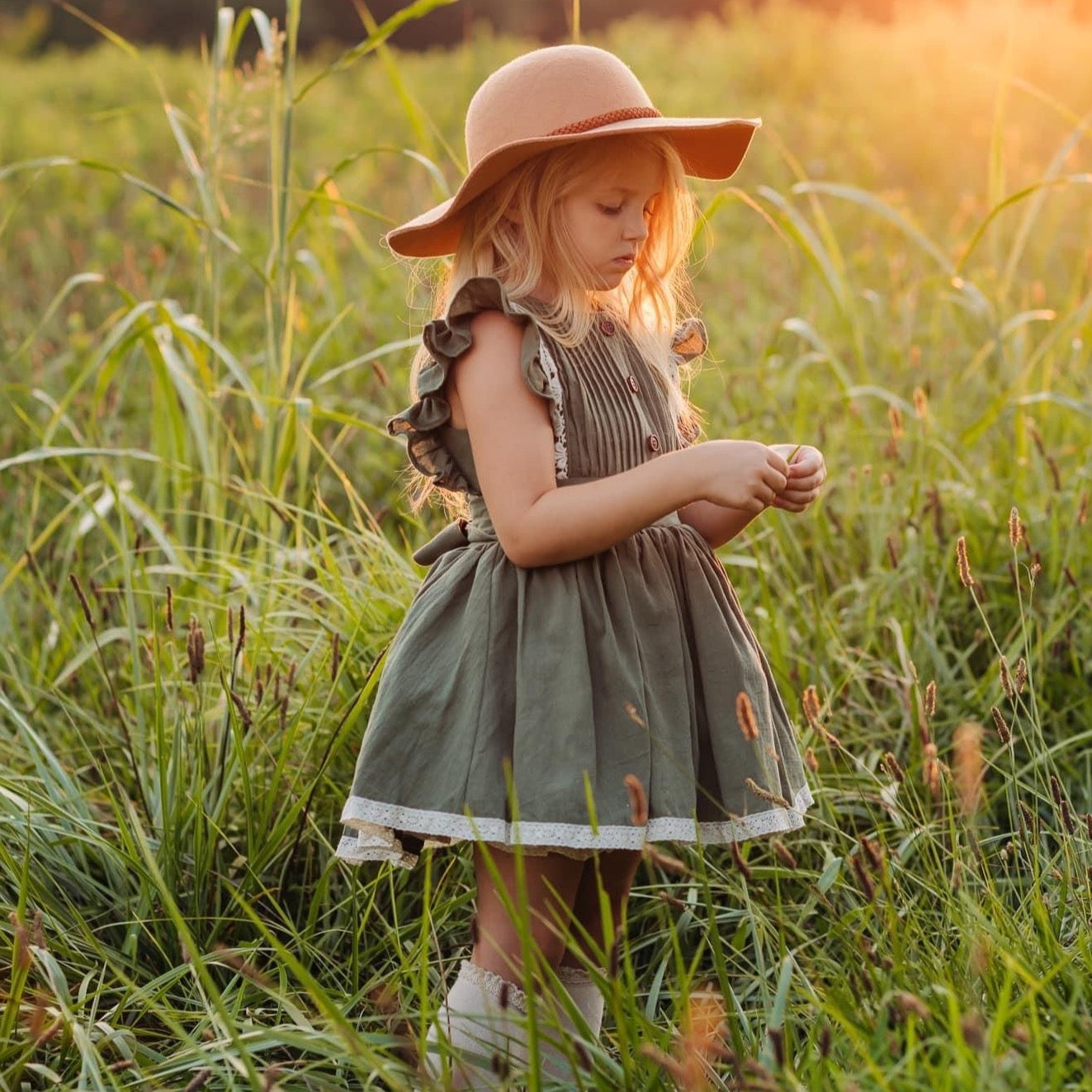 Norah is back! In the most beautiful olive almost sage green. This time we flipped the pintucks to vertical and added wooden buttons on the chest.