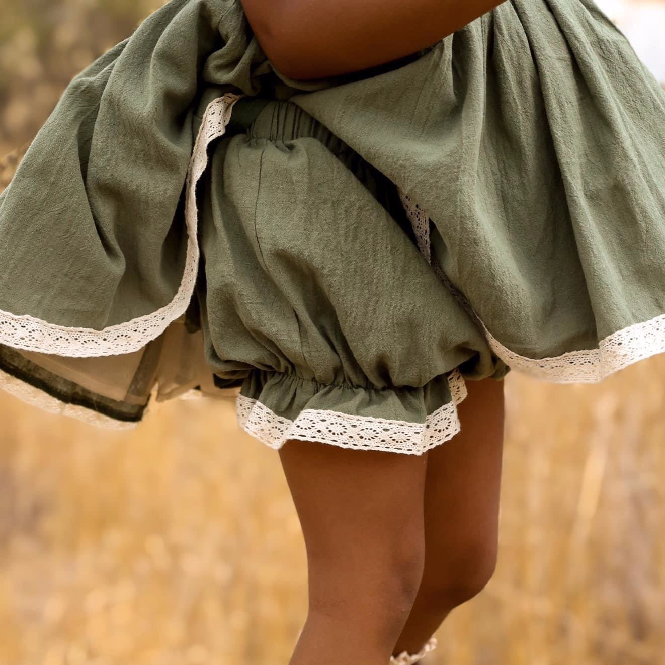 •vintage cream crochet lace on chest, back and skirt trim. Also on the bloomer shorts.