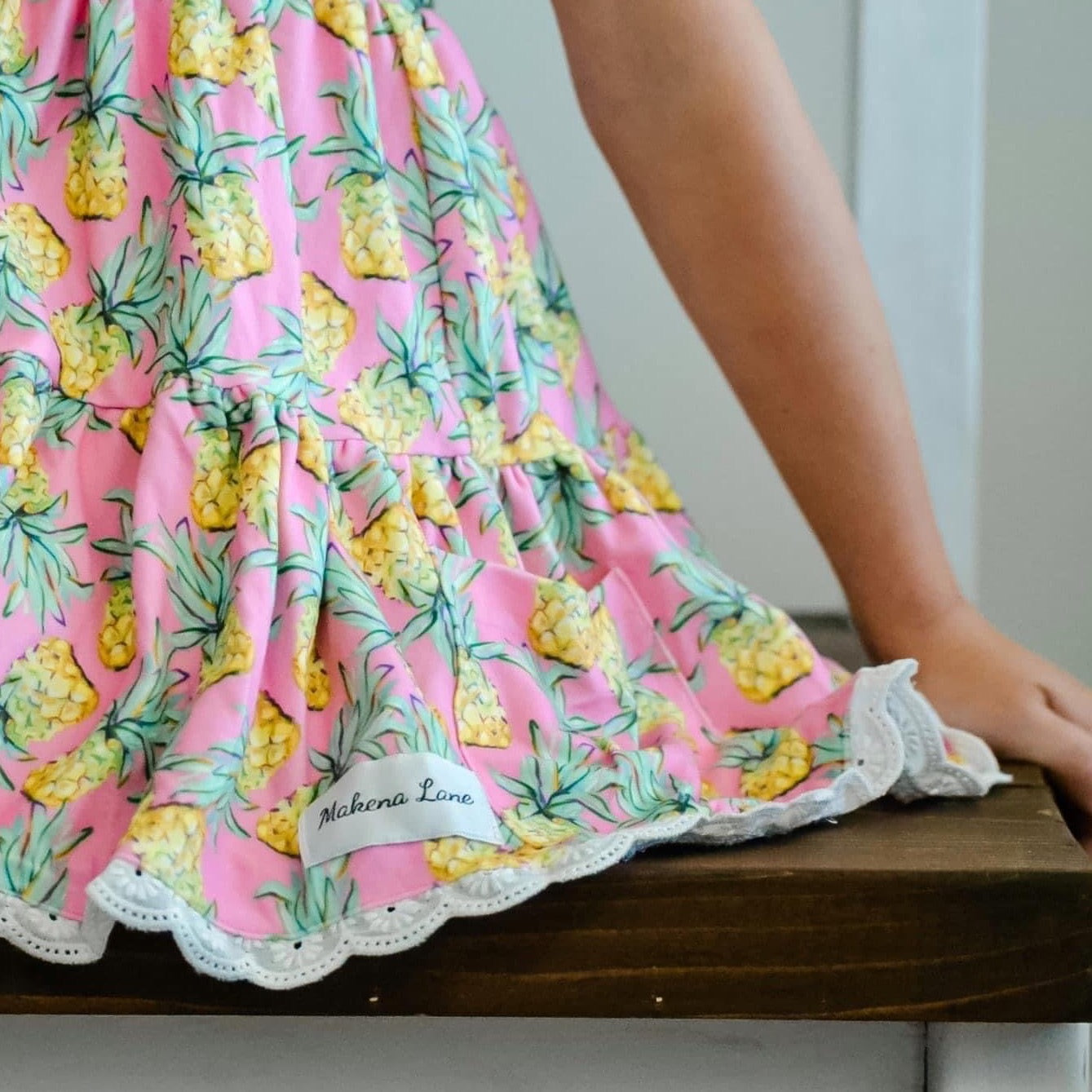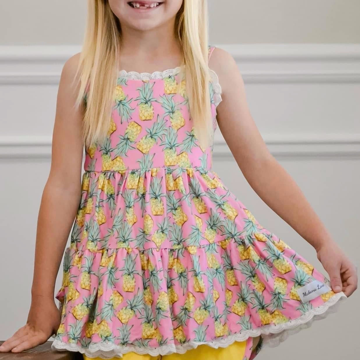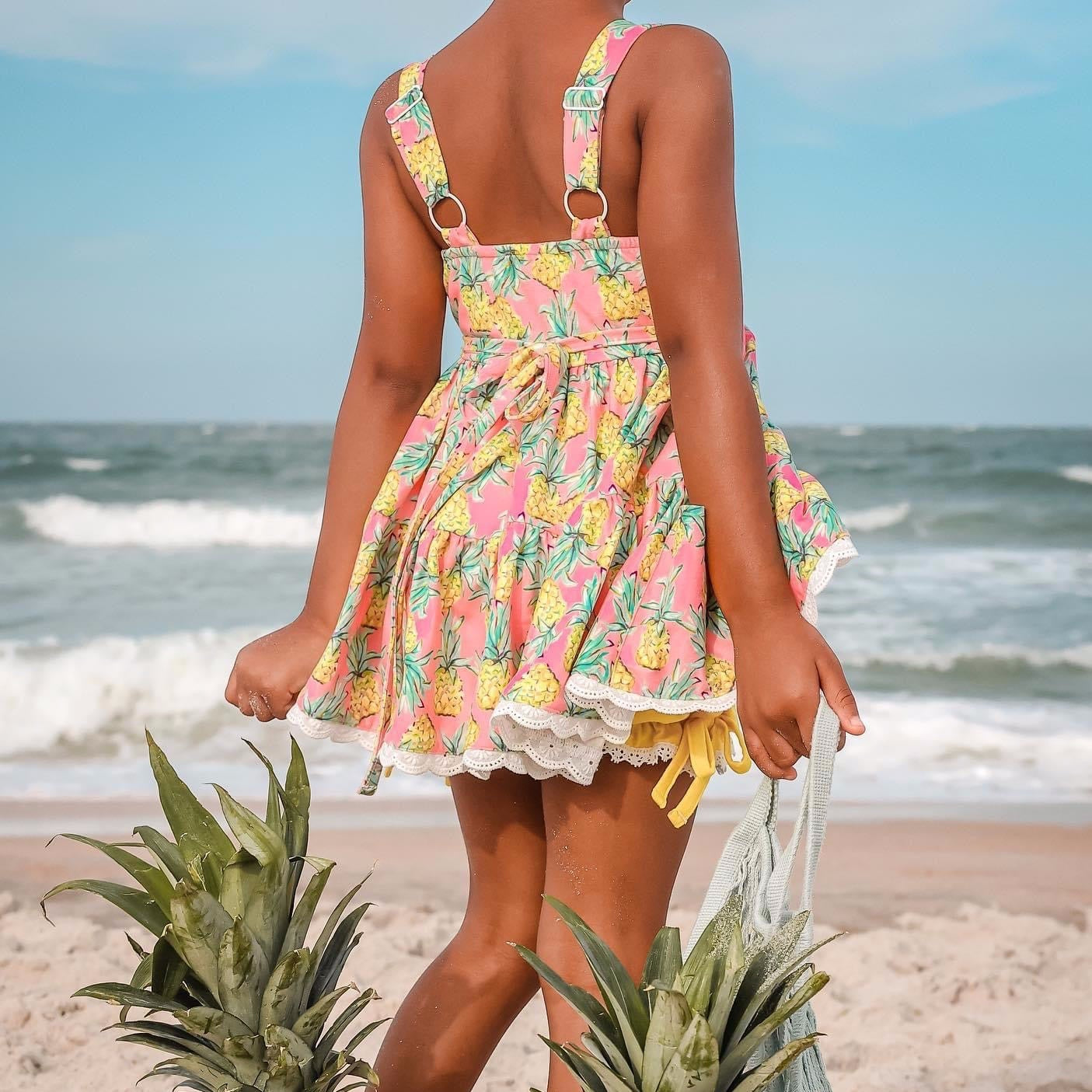 Our shop fave Playset silhouette in the prettiest pineapple print in pink, yellow and some green! A bright colored cozy tunic and shorts/bloomers!