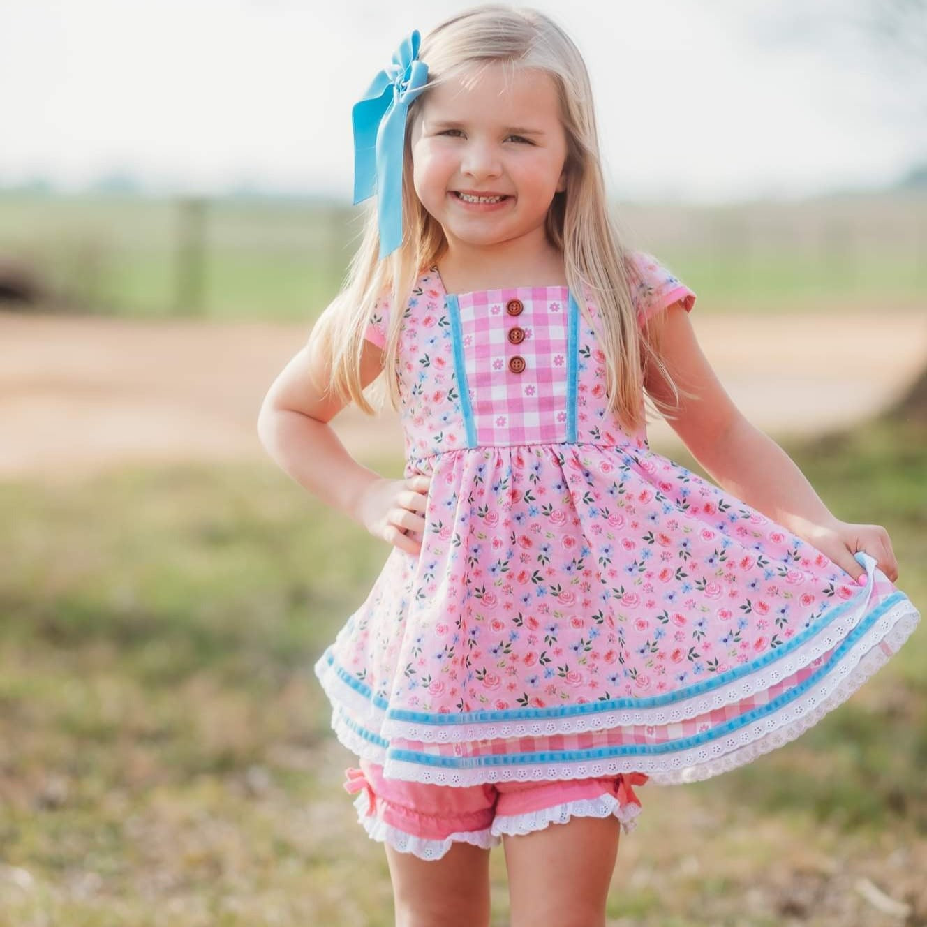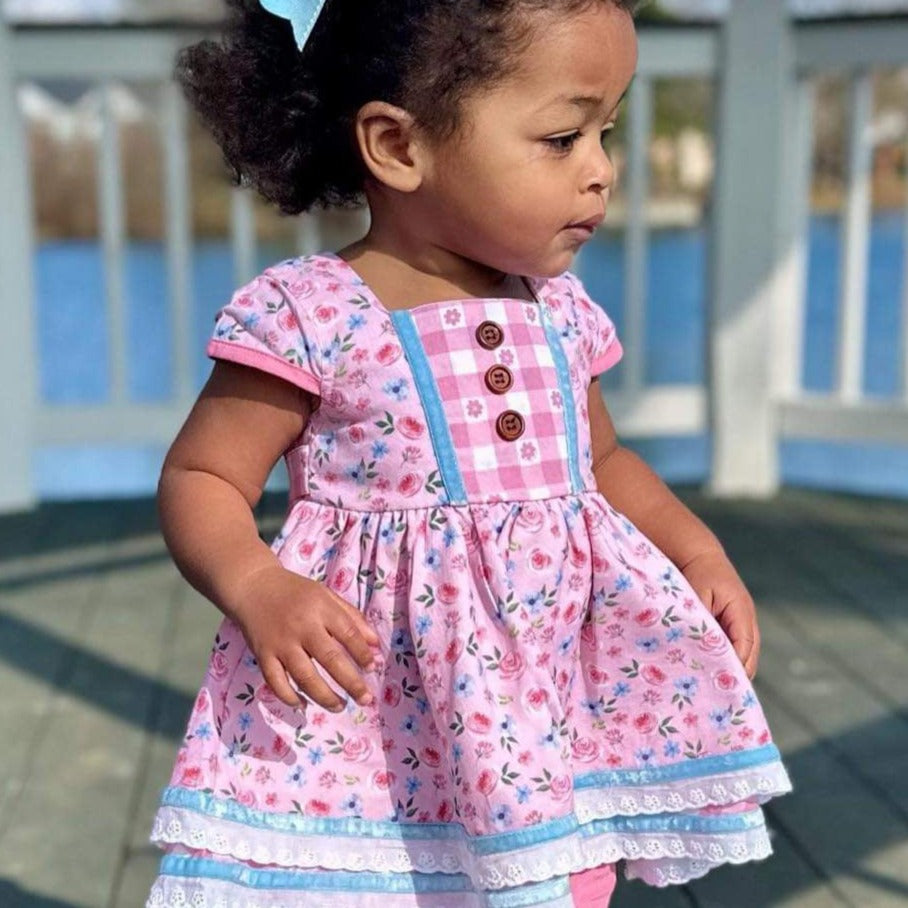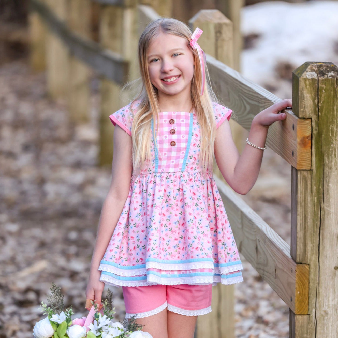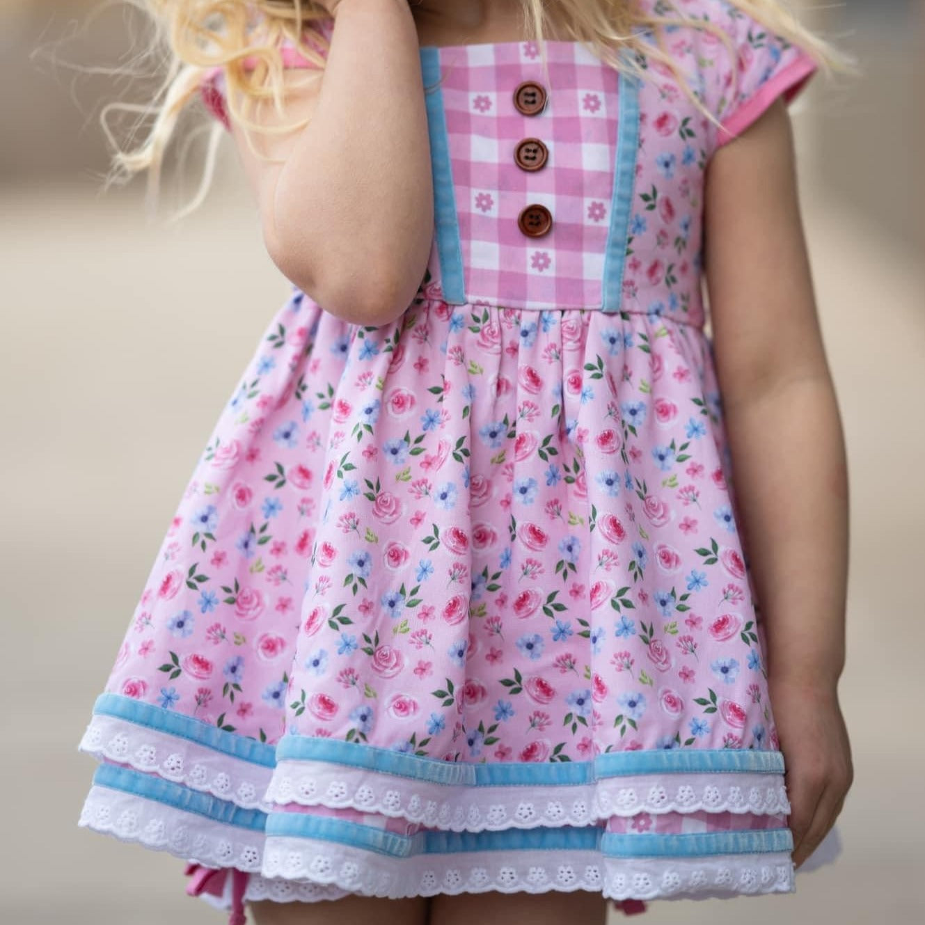 •pink gingham with flowers linen tape trim on the cap sleeves.