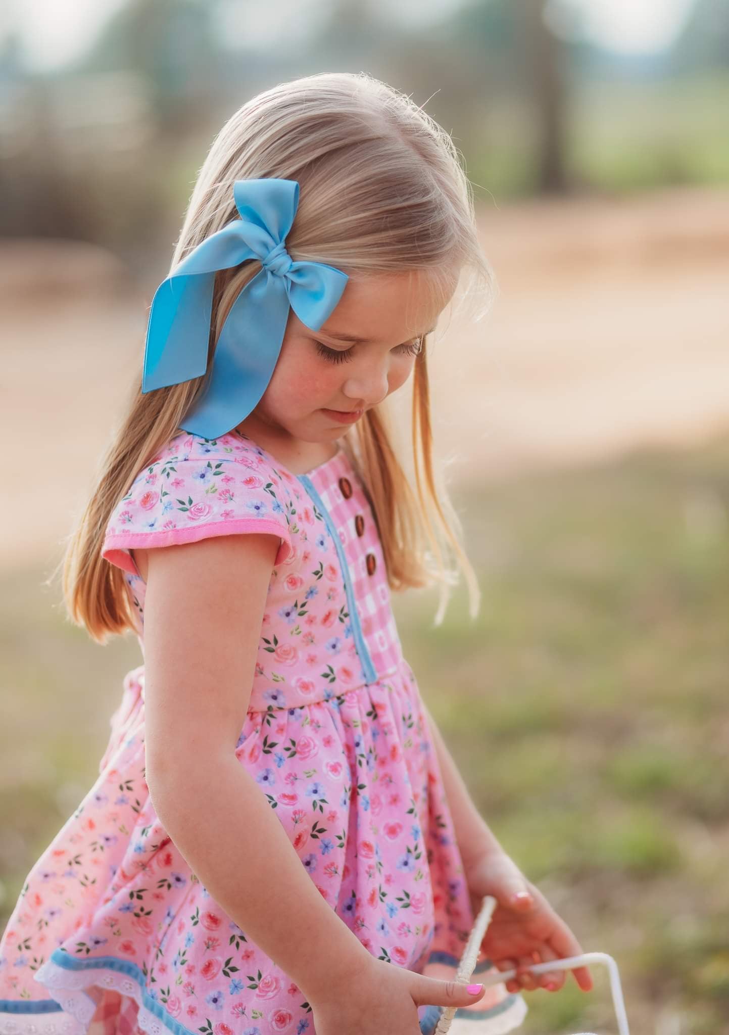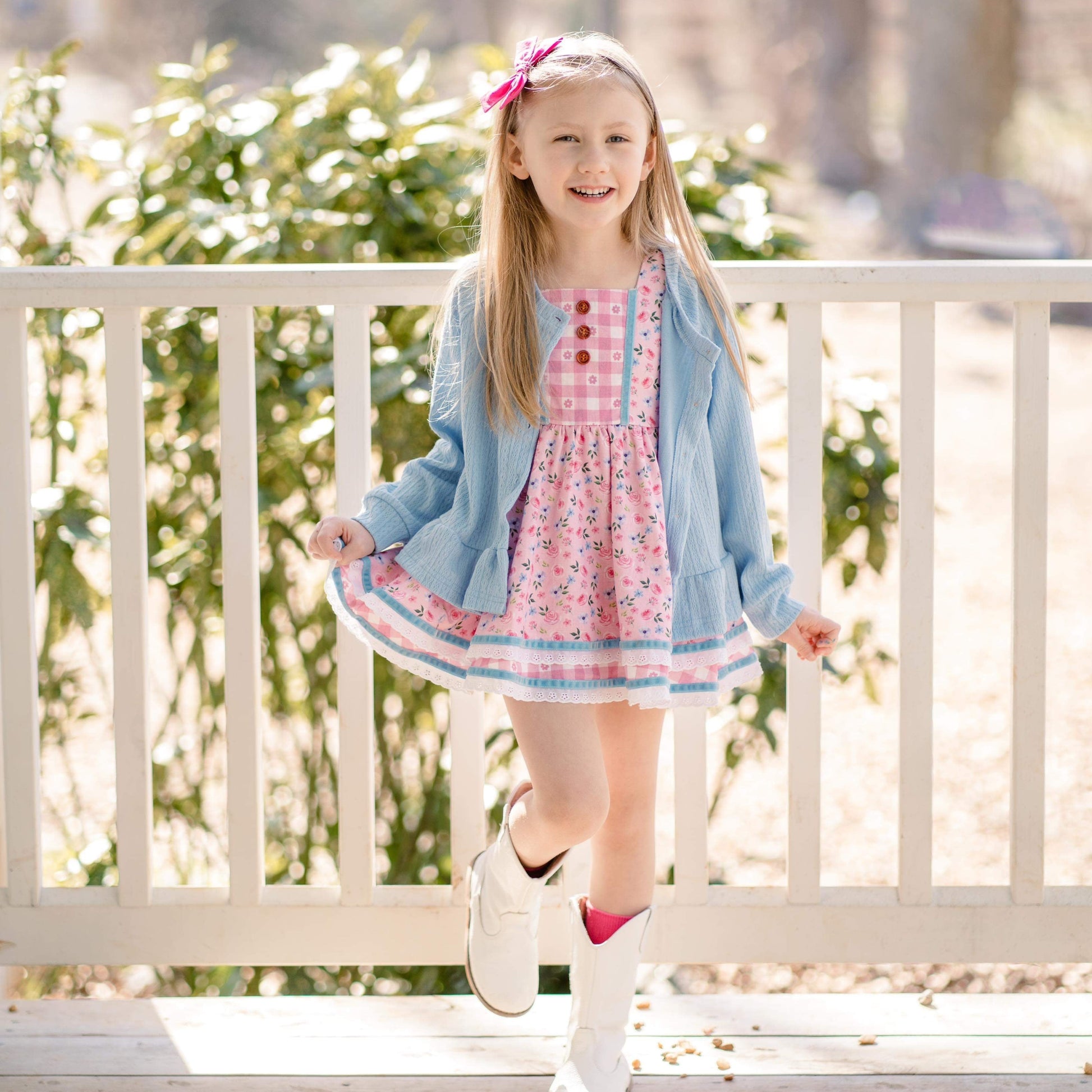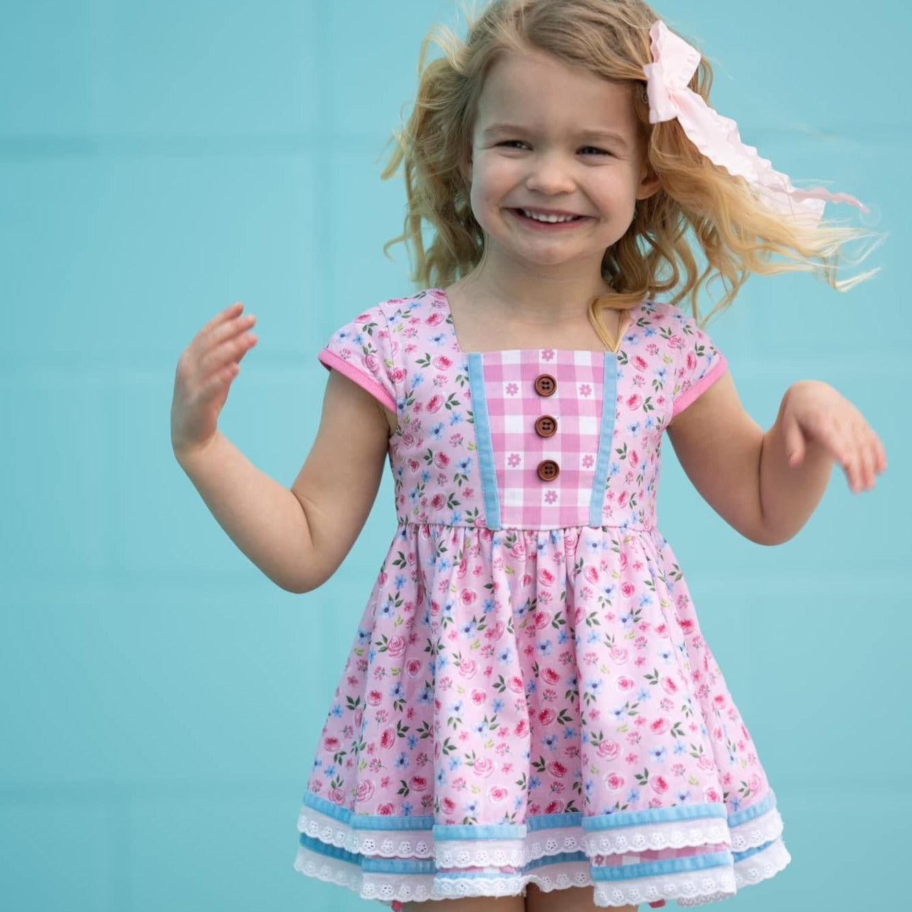 •pink gingham with flowers linen tape trim on the cap sleeves.