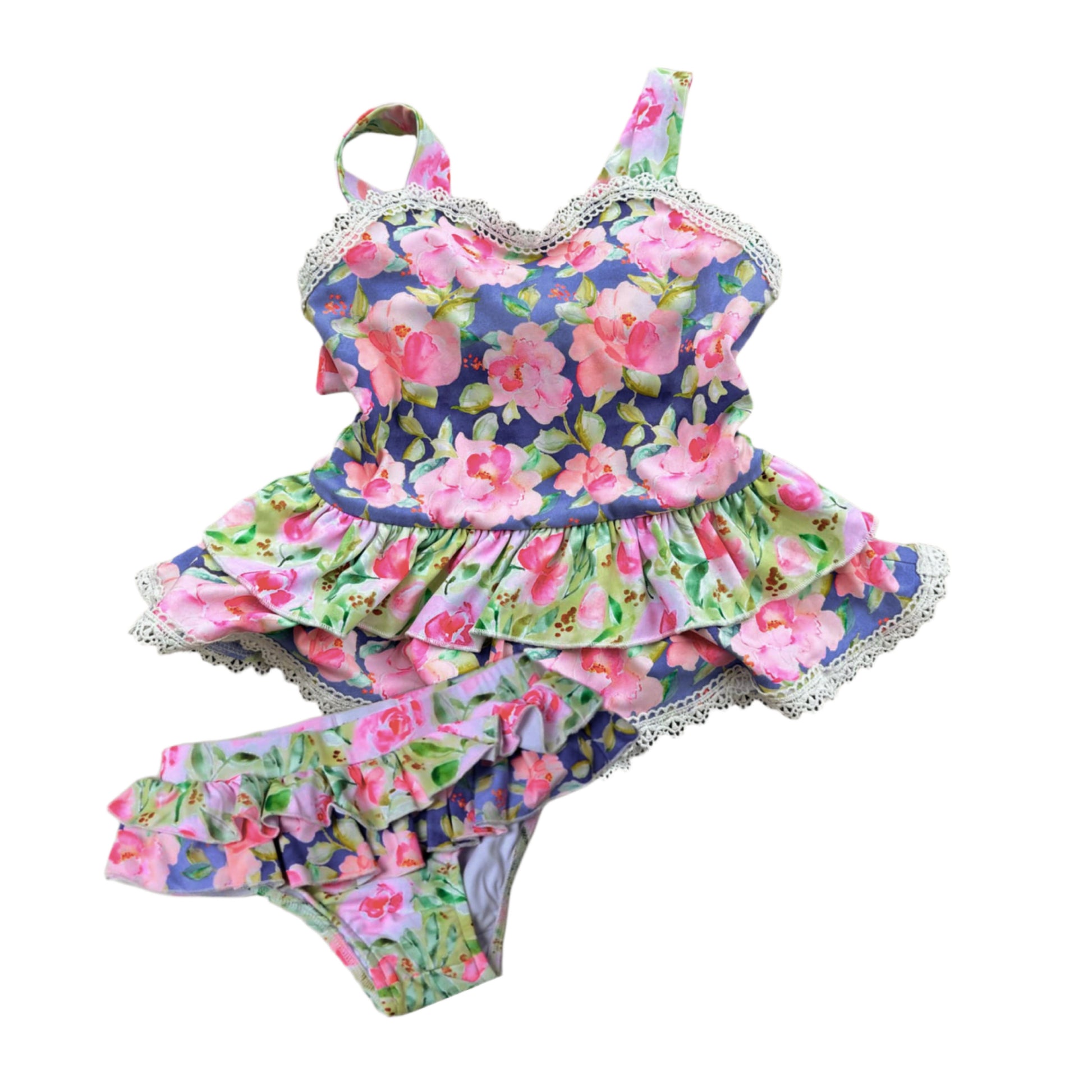 Ruffled bottoms size 12m-6, simple no ruffle higher waist bottoms size 7-16 (see photos of past tankini releases for fit!)